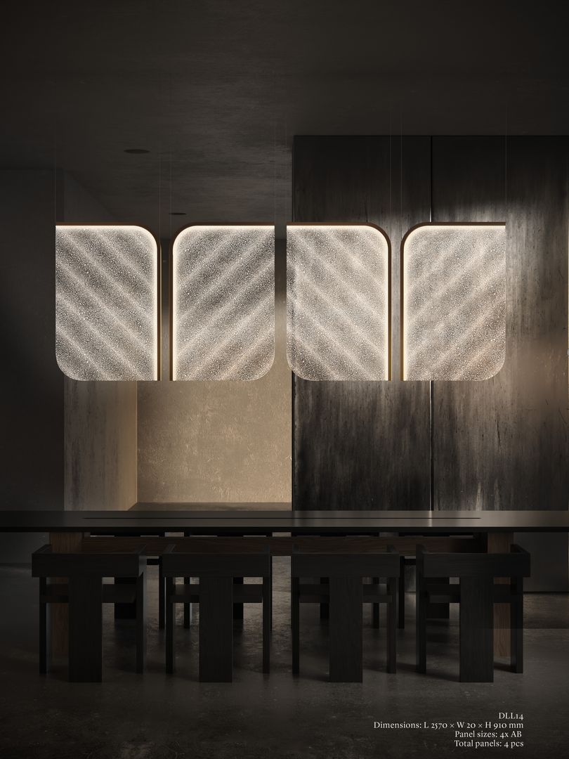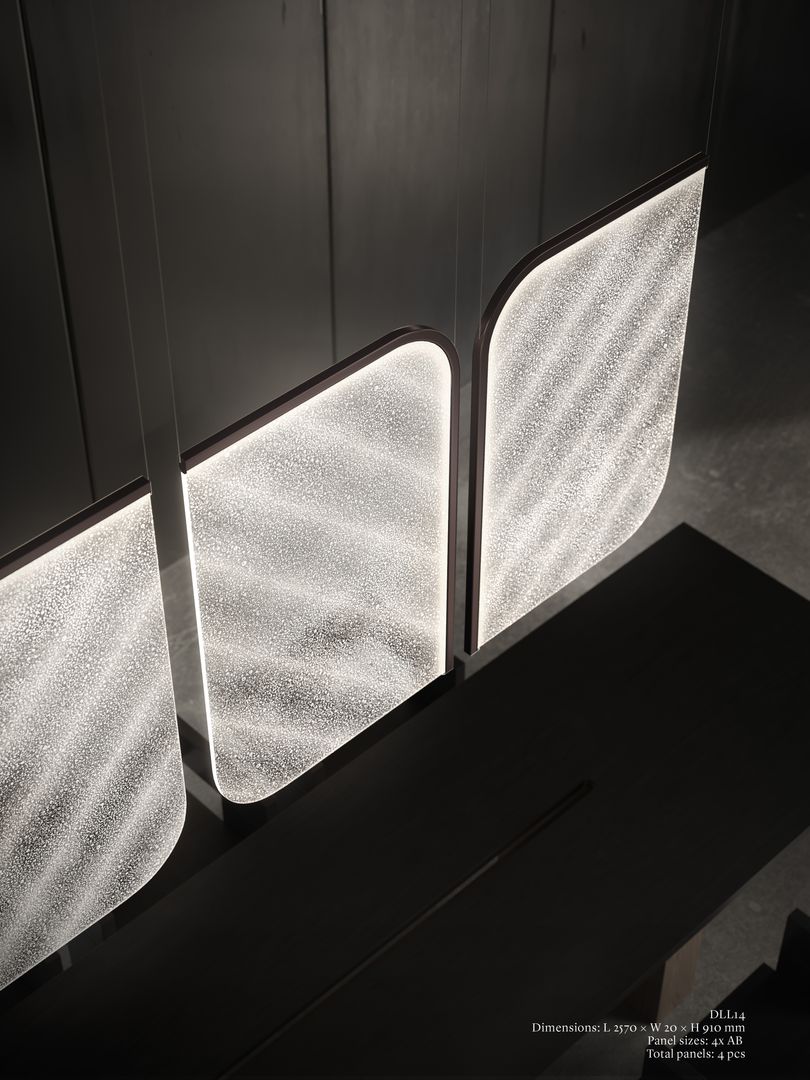 在玻璃層層熔融融合的過程中,自然的「鍊金效應」催生出氣泡,構築出一幅具有生命感的光之畫布。俐落排列的玻璃面板懸浮於鋼構輪廓之中,結合靜態或動態光源,最終呈現出如墨入水般緩緩擴散、令人沉醉的光影投射。